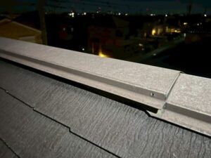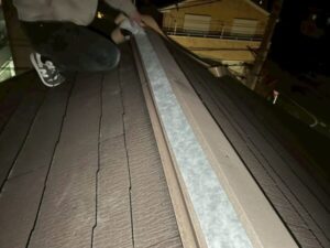 既存屋根の上からカバー工法を行うため、棟板金を撤去して下準備を行います。