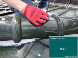 この後、棟の下地を漆喰で作りますが、その密着に支障をきたさないようにゴミを綺麗に清掃します。