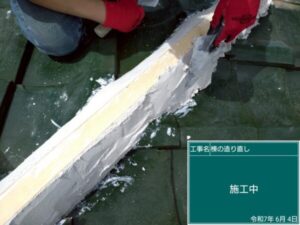 漆喰が十分な厚みが出るまで詰め直せたら、棟の冠瓦を所定の位置で釘にて固定します。