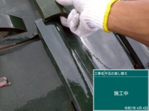 新しい瓦の設置では、隣合う瓦とのかみ合わせを確認しながら差し込みます。
