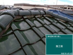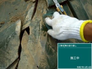 また、棟の積み直し・漆喰詰め直しにて対応させて頂きました。