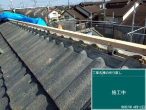 既存の棟瓦・漆喰を取り外し、心木(右の写真の木材)を取り付けます。